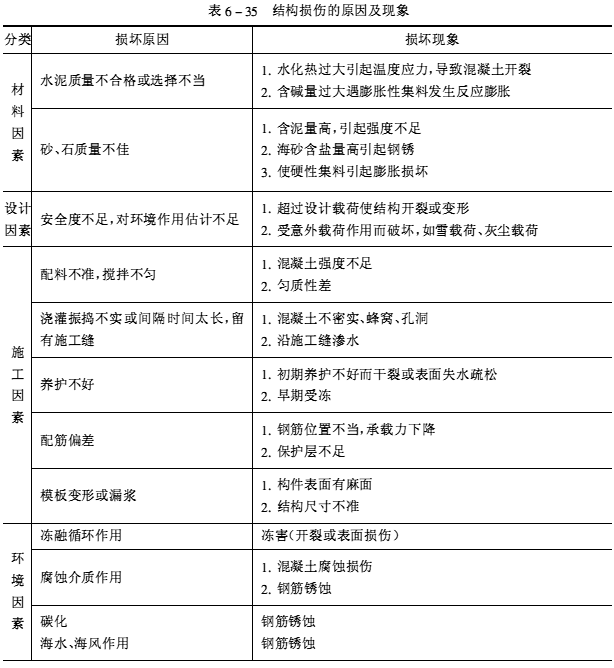 引起鋼筋混凝土結構損壞的原因有多種,既有結構設計、施工方面的原因,又有原材料及結構使用環(huán)境方面的原因。現(xiàn)簡要歸納結構損傷原因列于表6-35。