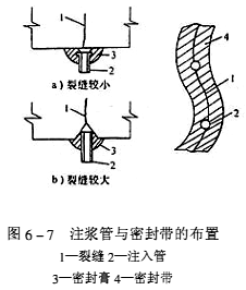 ![]() 采用有管注漿法時,在裂縫修補之前首先要沿裂縫以10~30cm的間距設置注漿管(圖6-7),然后將裂縫的其他部位用膠粘帶予以密封,以防漏漿。注漿管有帶墊圈的與無墊圈的,前者用于不開V形槽的裂縫注漿,后者則適用于開V形槽的寬裂縫注漿,如圖6-8。