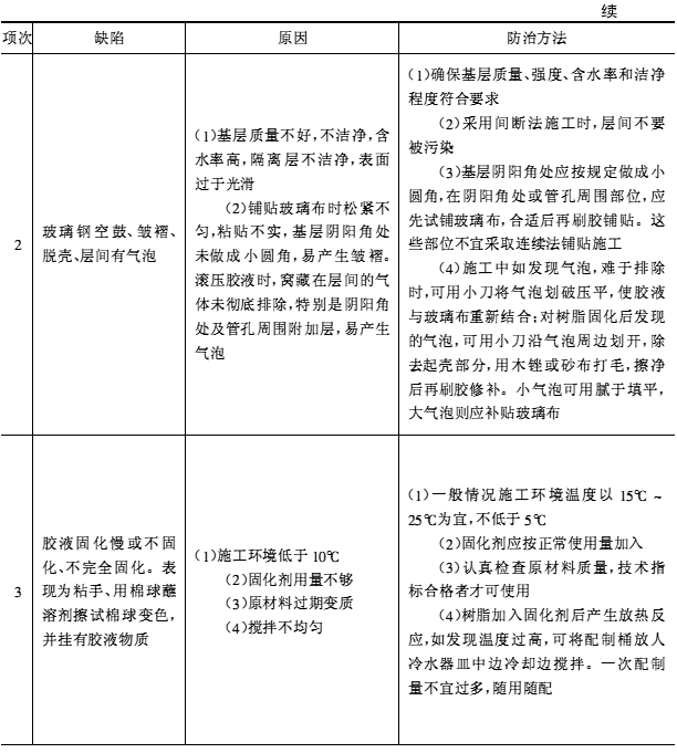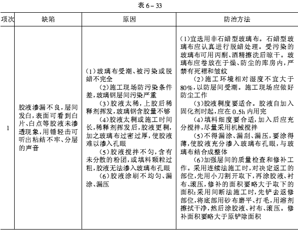 七、樹脂類防腐蝕工程常見缺陷及防治方法(見表6-33)