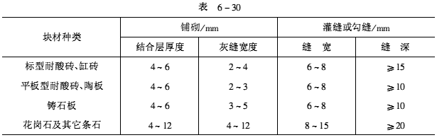 樹脂膠泥鋪砌塊材的結合層厚度、灰縫寬度和勾縫尺寸見表6-30。