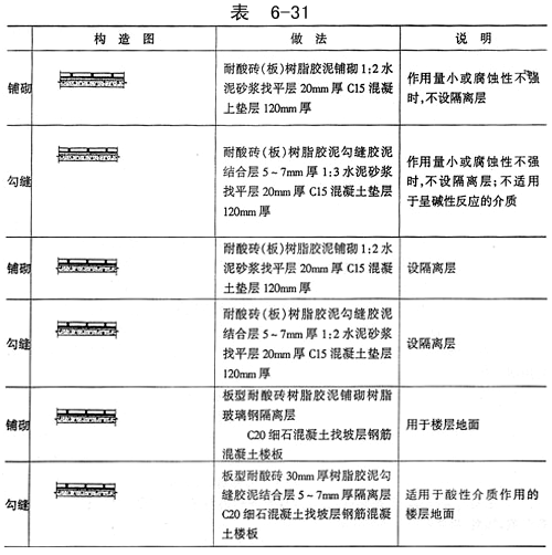 ![]() (3)樹脂膠泥或砂漿鋪砌與勾縫構造舉例(表6-31)。