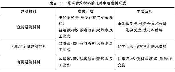 避免腐蝕的一個最重要因素是了解腐蝕是如何發(fā)生的。表6-14是影響建筑材料的幾種主要腐蝕形式。