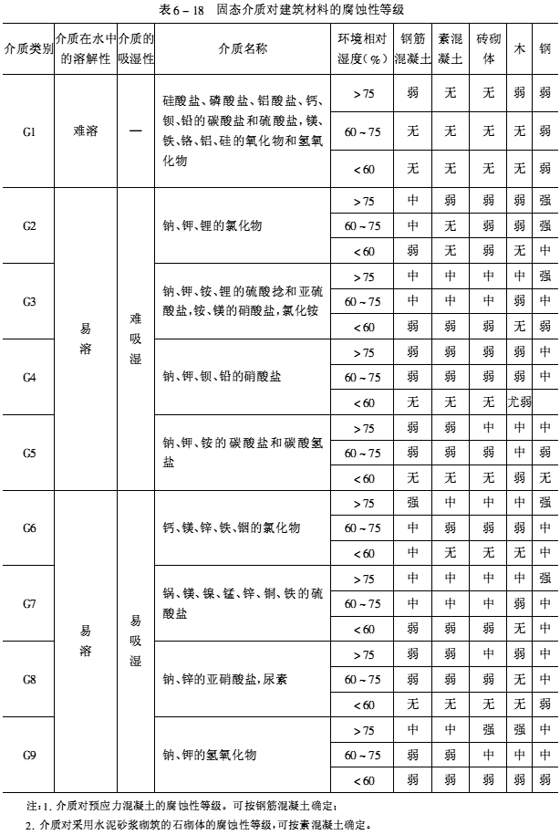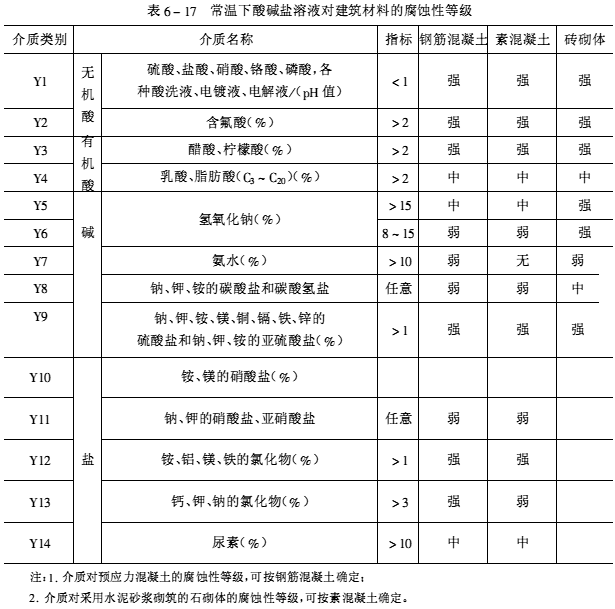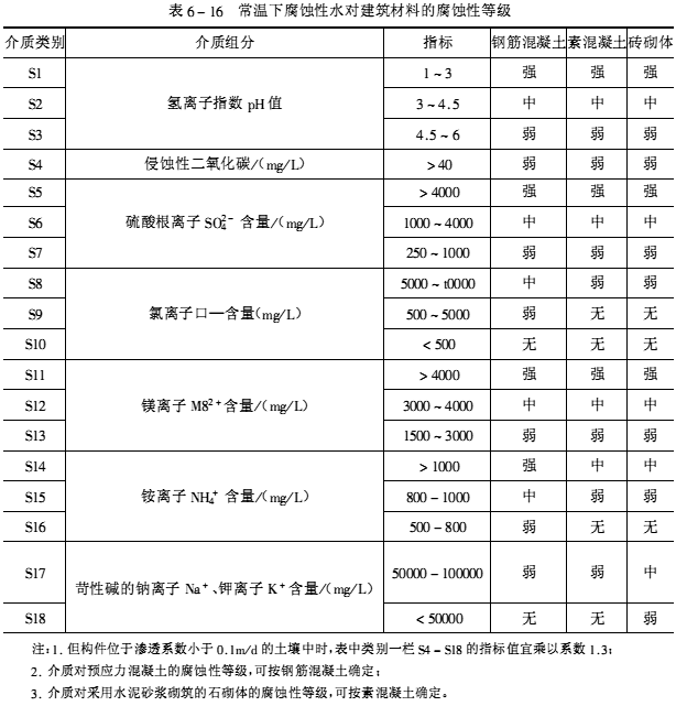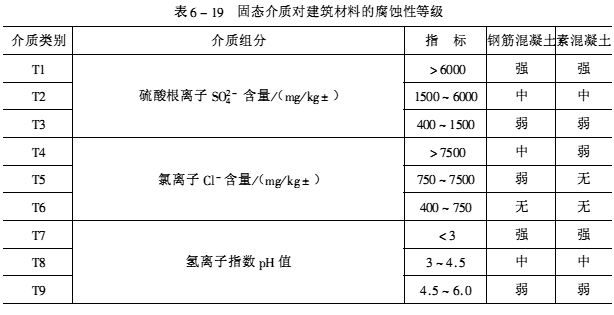 根據腐蝕性介質的形態(tài)及其對建筑結構的腐蝕特征可分為五大類:即氣態(tài)介質、腐蝕性水、酸堿鹽溶液、固態(tài)介質和污染土。各種介質可按其性質、含量劃分類別,根據各種介質對建筑材料長期作用下的腐蝕性,又可分為強腐蝕、中等腐蝕、弱腐蝕、無腐蝕四個等級,見表6-15~表6-19。設計、施工單位可按工程的腐蝕特征,選擇適當的耐腐蝕材料和采取有效的防護措施。