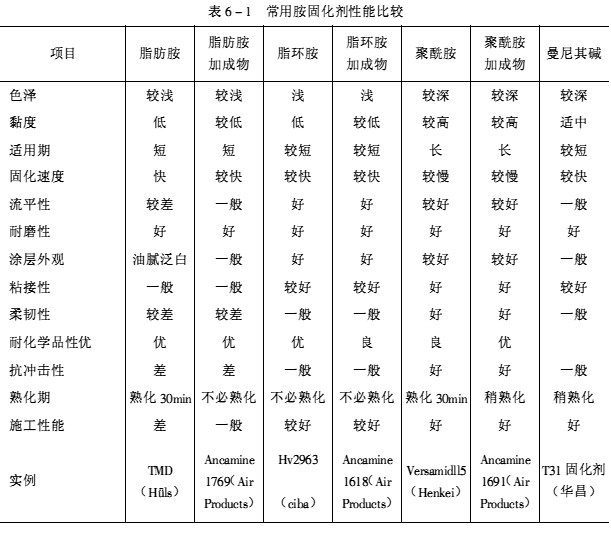 胺類固化劑是環(huán)氧涂料的主要固化劑,這類固化劑主要有脂肪胺、脂肪胺加成物、脂環(huán)胺、脂環(huán)胺加成物、聚酰胺、聚酰胺加成物、曼尼其堿等。表6-1為常用胺固化劑性能比較。