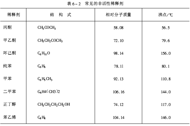 (1)非活性稀釋劑本身不參與固化反應(yīng),僅達(dá)到物理混合和減低黏度的目的。一般加入量為樹脂重量的5%~15%,在樹脂固化時,會有部分逸出,從而增加樹脂的收縮率,降低粘結(jié)力、機(jī)械強(qiáng)度及熱變形溫度,嚴(yán)重時甚至?xí)a(chǎn)生氣孔。溶劑型環(huán)氧地面涂料使用時應(yīng)特別注意。常見的非活性稀釋劑見表6-2。