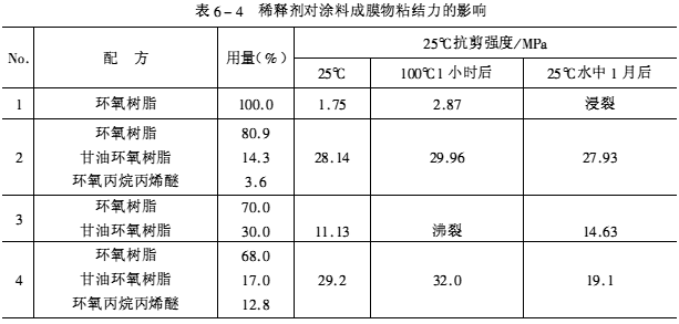 ![]() 稀釋劑用量過多,對性能也有一定的影響。由于稀釋劑本身是短鏈分子,碳鏈比環(huán)氧樹脂短,因而阻礙了鏈的形成,影響了成膜物的主要性能。例如:稀釋劑及其濃度與固化后成膜的的粘結(jié)力關(guān)系見表6-4所示。