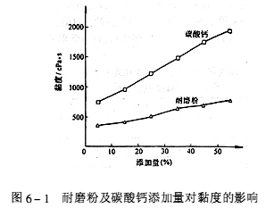 ![]() ![]() (2)填料添加量對涂料黏度的影響。無論是施工性還是從成膜物的性能看,地面涂料的黏度是至關(guān)重要的。一方面希望涂料的固體含量盡量高,可降低成本,達(dá)到一次成膜厚的目的;一方面又不希望黏度太高,黏度高不利于施工,影響成膜物的流平性、消泡性。通過實驗發(fā)現(xiàn):耐磨礦物粉加入量對涂料黏度影響變化較少(見圖6-1)。這是由于天然礦物粉與碳酸鈣相比有相對低的吸油量所致。在相同吸油量的涂料中(輕質(zhì))碳酸鈣的加入量不超過30%,而天然礦物粉加入量可達(dá)50%以上。
