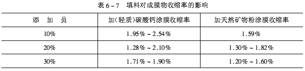 ![]() (3)填料添加量對涂膜線收縮率的影響。對環(huán)氧耐磨地面涂料而言,其最大的優(yōu)勢就在于可做到一次施工面積大,整體無縫,這就對涂膜線性收縮率有較高要求,填料對涂膜線收縮率的實驗數(shù)據(jù)見表6-7。
