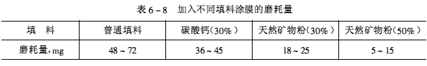 ![]() (4)填料對涂膜磨耗量的影響。根據(jù)GB/T1768—89實驗測試,(CS17,500*2g,1000R。)結(jié)果見表6-8。