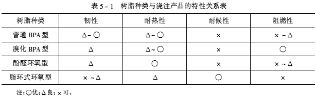用于澆注的環(huán)氧樹脂以BPA型樹脂為主。通常使用相對(duì)分子質(zhì)量在1000以下的中、低相對(duì)分子質(zhì)量的樹脂。由于環(huán)氧樹脂必須同固化劑及其他添加劑固化成型后,才能呈現(xiàn)出其材料的特性。因此固化劑和其他添加劑也同樣影響澆注件的性能。單就環(huán)氧樹脂而言,相對(duì)分子質(zhì)量越大,其澆注產(chǎn)品的韌性越好,在要求澆注產(chǎn)品有一定機(jī)械強(qiáng)度和韌性的用途中,通常選用相對(duì)分子質(zhì)量在500~1000的固體樹脂。在要求有較好的加工操作性能時(shí),常使用相對(duì)分子質(zhì)量低于500的液體樹脂或液體樹脂與固體樹脂混用。為了提高耐熱性能,可以采用添加多功能團(tuán)的環(huán)氧樹脂。如酚醛環(huán)氧樹脂。為了提高阻燃性能,可以添加鹵素化環(huán)氧樹脂。為了提高耐候性能,可以選用脂環(huán)族環(huán)氧樹脂。不同環(huán)氧樹脂與其澆注產(chǎn)品的特性關(guān)系見表5-1。