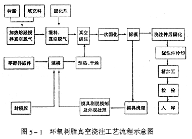 真空澆注工藝是目前環(huán)氧樹脂澆注中應(yīng)用最為廣泛、工藝條件最為成熟的工藝方法。環(huán)氧樹脂真空澆注常見的工藝流程示意圖見圖5-1。