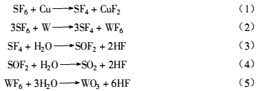 在氣體絕緣開關(guān)中,常用SF6作為消弧媒體和絕緣媒體,SF6在通常情況下是穩(wěn)定的氣體,但在斷路時(shí)由于電極觸點(diǎn)間發(fā)生的電弧作用,會(huì)分解出具有活性的SF4等氣體。SF4在有微量水分存在下,會(huì)發(fā)生水解而生成SOF2、HF等。